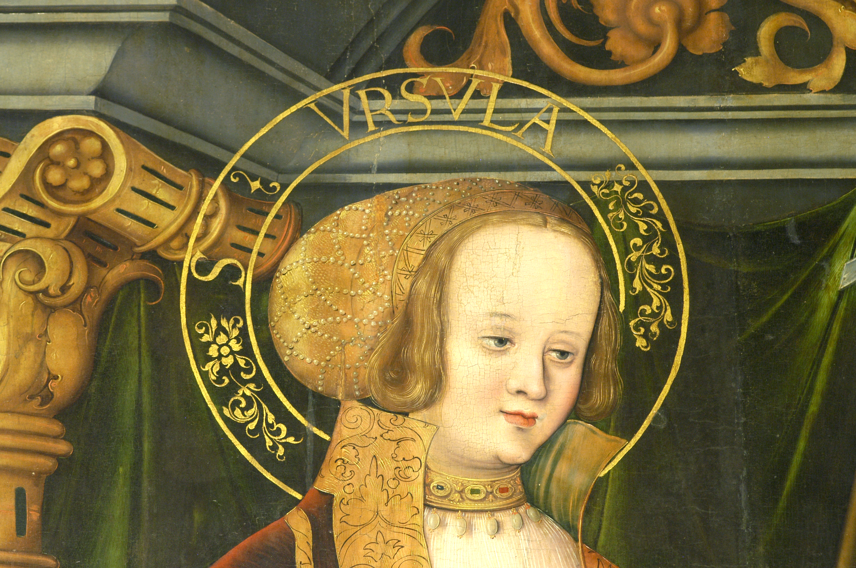 Halle, Marktkirche, Altaraufsatz, Detail mit hl. Ursula (1529)