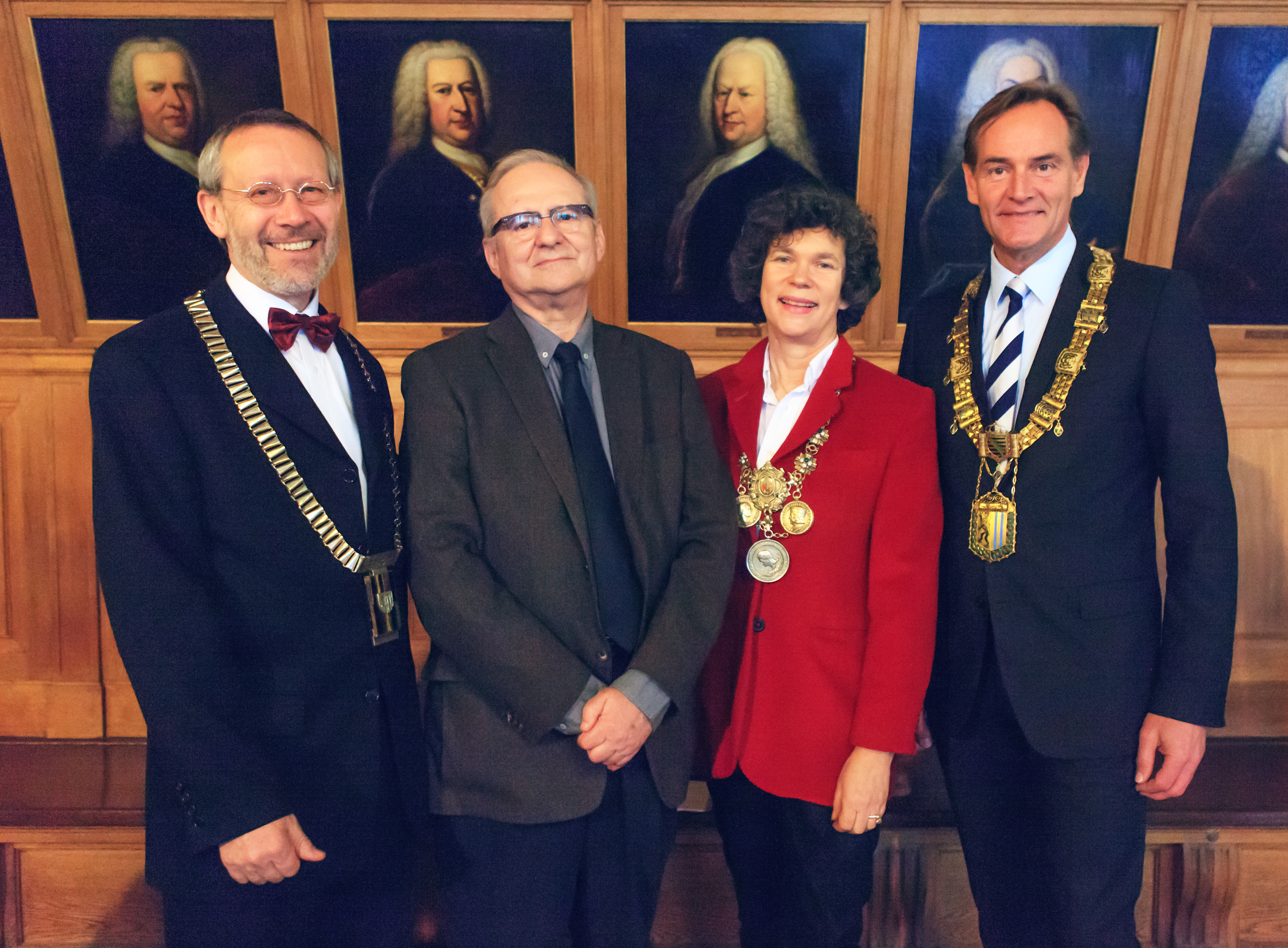 von links: Prof. Dr. Pirmin Stekeler-Weithofer, Präsident der Sächsischen Akademie der Wissenschaften zu Leipzig; Prof. Dr. Dan Diner (Preisträger), Direktor des Simon-Dubnow-Instituts für jüdische Geschichte und Kultur an der Universität Leipzig, Professor für Moderne Geschichte an der Hebräischen Universität Jerusalem und Ordentliches Mitglied der Sächsischen Akademie der Wissenschaften zu Leipzig; Prof. Dr. Beate A. Schücking, Rektorin der Universität Leipzig; Oberbürgermeister Burkhard Jung (Stadt Leipzig), Foto: Swen Reichhold